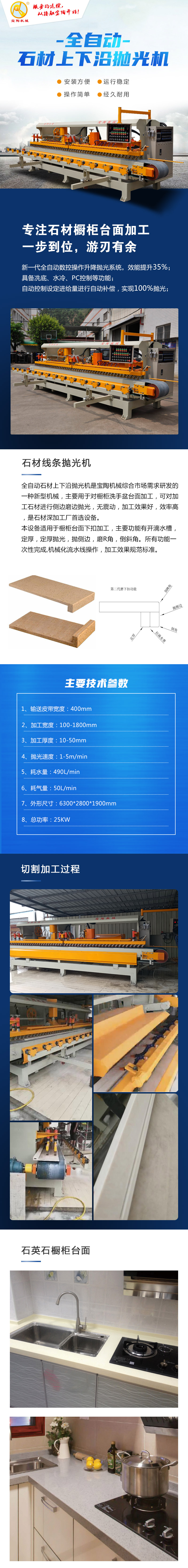 本機配置為 1個修直邊、6個拋直邊, 1個定厚、2個定厚拋光, 1個開滴水槽,2個上面R圓弧拋光, 6個下面R圓弧拋光。可進行臺面上下小圓角、定厚、定厚拋光、倒斜角、開止水槽、側面拋光一次完成;一分鐘一米左右。 整體光潔度高、效率高,輸送帶傳動,適合流水線作業(yè)。石英石櫥柜臺面加工設備的首選設備。
