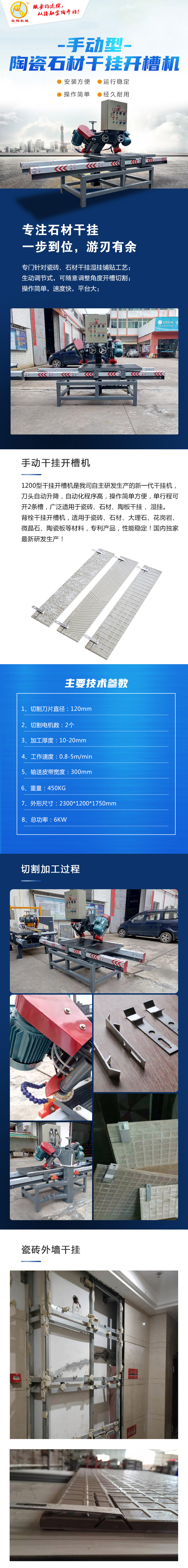 BT-1200手動(dòng)型瓷磚干掛開槽機(jī)采用雙刀頭氣動(dòng)自動(dòng)感應(yīng)控制升降,由行程開關(guān)自動(dòng)控制切割距離,自動(dòng)化程度高,可左右上下調(diào)節(jié),角度大小也可調(diào)節(jié),操作方便,加工燕尾干掛效果好,不崩邊不掉角,是石材、瓷磚干掛加工工藝首選設(shè)備,是我司自主研發(fā)生產(chǎn)的新一代干掛加工設(shè)備。
