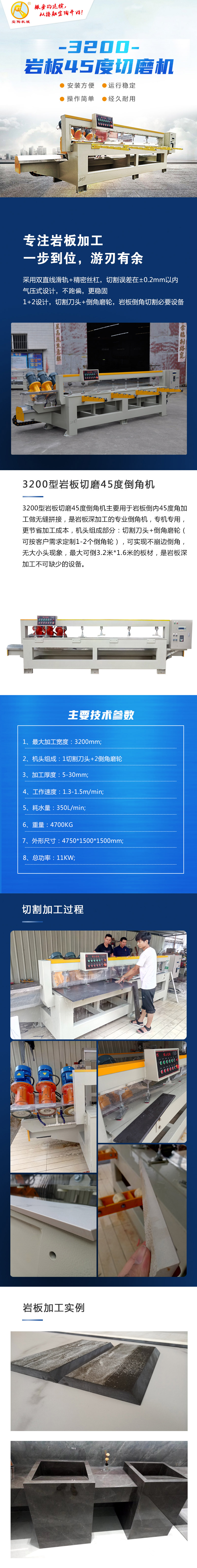 3200型巖板切磨45度倒角機主要用于巖板倒內45度角加工做無縫拼接,是巖板深加工的專業倒角機,專機專用,更節省加工成本,機頭組成部分:1個切割刀頭+2個倒角磨輪,可實現不崩邊倒角,無大小頭現象,最大可倒3.2米*1.6米的板材,是巖板深加工不可缺少的設備。
