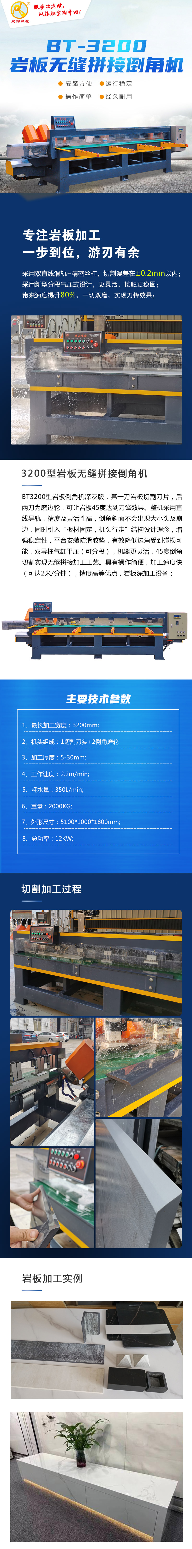 BT3200型巖板45度倒角機,第一刀巖板切割刀片,后兩刀為磨邊輪,可讓巖板45度達到刀鋒效果。整機采用直線導軌,精度及靈活性高,倒角斜面不會出現大小頭及崩邊,同時引入“板材固定,機頭行走”結構設計理念,增強穩定性,平臺安裝防滑膠墊,有效降低邊角受到碰損可能,雙導柱氣缸平壓(可分段),機器更靈活,45度倒角切割實現無縫拼接加工工藝。具有操作簡便,加工速度快(可達2米/分鐘),精度高等優點,巖板深加工設備;