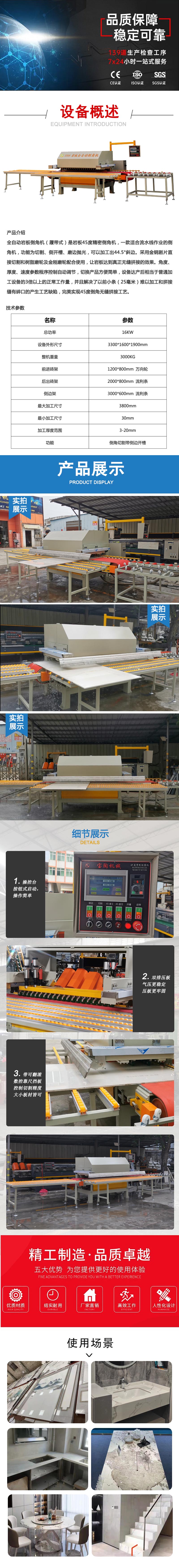 全自動巖板倒角機(履帶式)是巖板45度精密倒角機,一款適合流水線作業的倒角機,功能為切割、側開槽、磨邊拋光,可以加工出44.5°斜邊。采用金鋼劇片直接切割和樹脂磨輪及金剛磨輪配合使用,讓巖板達到真正無縫拼接的效果。角度、厚度、速度參數程序控制自動調節,切換產品方便簡單,設備達產后相當于普通加工設備的3倍以上的正常工作量,并且解決了以前小條(25毫米)難以加工和拼接縫有碎口的產生工藝缺陷,完美實現45度倒角無縫拼接工藝。